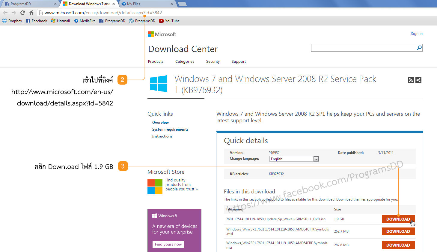 ลิงค์ดาวน์โหลด SP1 For Windows 7 >> http://www.microsoft.com/en-us/download/details.aspx?id=5842