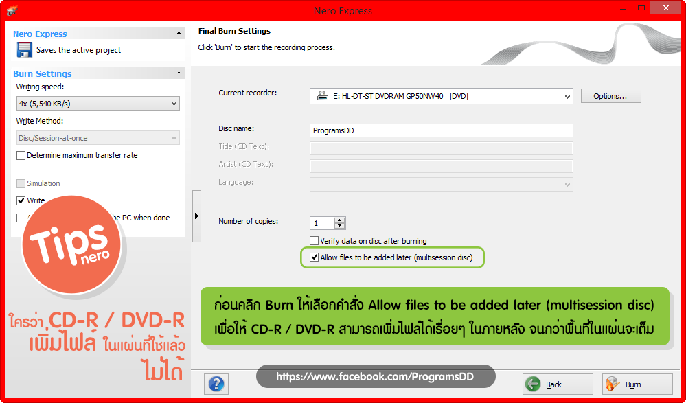 ใครว่า CD-R/DVD-R เพิ่มไฟล์ในแผ่นที่ใช้แล้วไม่ได้ ที่จริงทำได้โดยก่อนคลิก Burn ให้เลือกคำสั่ง Allow files to be added later (multisession disc) เพื่อให้ CD-R / DVD-R สามารถเพิ่มไฟล์ได้เรื่อยๆ ในภายหลัง จนกว่าพื้นที่ในแผ่นจะเต็ม หากไม่เลือกคำสั่งนี้ในตอน Burn ครั้งแรก จะทำให้แผ่น CD-R/DVD-R ไม่สามารถบันทึกข้อมูลเพิ่มในภายหลังได้นั่นเอง