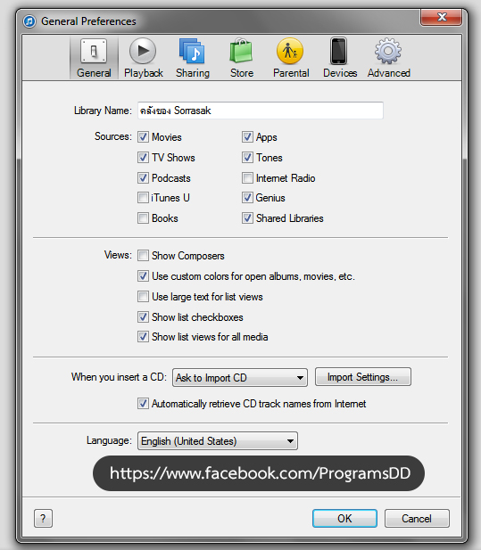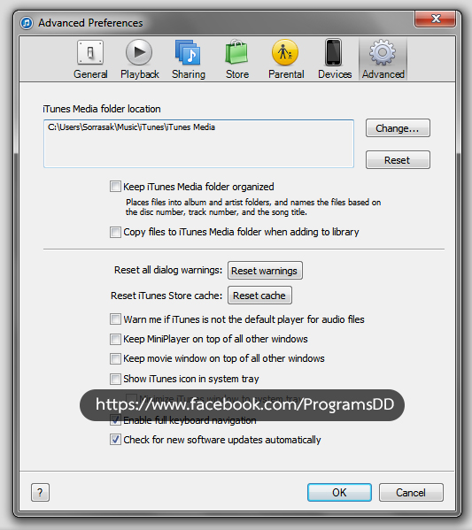 2. ที่เมนู Preferences ให้ไปที่ Tab Advanced.. จะสังเกตุเห็นว่า ในช่อง iTunes Media Folder Location ถ้าหากไม่มีการกำหนดอะไร ค่าปรกติจะเป็น “C:\Users\ชื่อผู้ใช้\Music\iTunes\iTunes Media\Music”