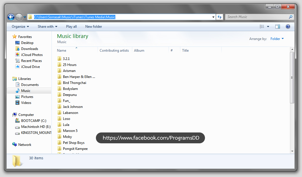 3. ให้ไปตาม พาร์ทที่อยู่ใน Preferences หรือจะ Copy แล้ววางที่ Windows Explorer ก็ได้.. เราจะเห็น Folder เรียงเป็นศิลปิน ซึ่งเราสามารถนำ File เหล่านี้ไปใส่ในมือถือแอนดรอยด์ของเราก็ได้ หรือจะ เบิร์น ลง CD ไว้ฟังตอนเดินทางไปทำงาน หรือจะเอาไปใส่ MP3 ก็ได้