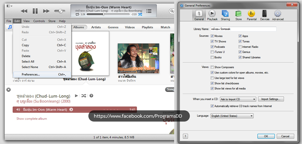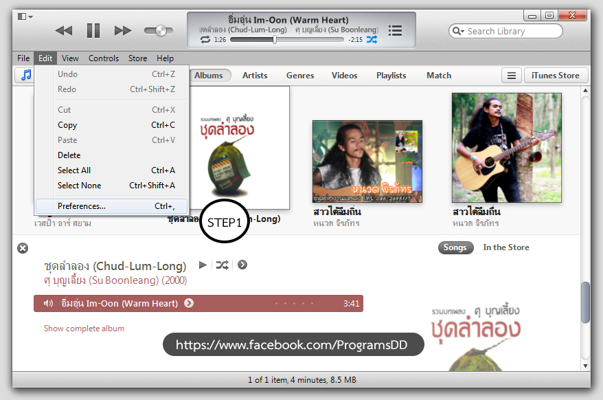 1. เปิด iTunes ไปที่ Edit -> Preferences… (หากไม่มีเมนูนี้ให้กด CTRL+B)